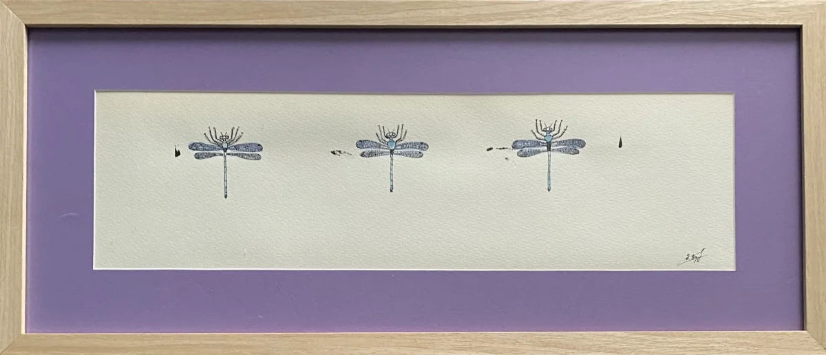 სამი ნემსიყლაპია ინსექტარიუმის სიჩუმეშია წარმოდგენილი — ნემსით შეჩერებული დრო, მინის მიღმა დაცული ფრთები. ერთნაირი სხეულები, ზუსტად გაზომილი, მაგრამ თითოეულში განსხვავებული ამბავი ჩუმად ფეთქავს. საერთო სივრცეში თავმოყრილი ერთი სახეობა, რომელთა მცირედი განსხვავებაც, შეუცვლელ ინდივიდებად აქცევს. ზომა: 14 x 50 სმ, 28 x 64 სმ ჩარჩოთი ტუში და აკვარელი ქაღალდზე